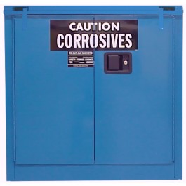The leak tight sump and shelves of the cabinet are equipped with removable corrosive-resistant polyethylene trays to contain accidental spills. Acid Cabinets are finished in corrosive-resistant blue urethane paint. Large warning label reads: "CAUTION CORROSIVES". Or choose your own special message or wording.
