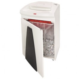 Cross-cut shredder features optimized cutting device technology that destroys 17 to 19 sheets of paper, creating 447 cross-cut/confetti-cut particles per page. It also shreds staples, paper clips, credit/store cards and CDs/DVDs. High-quality materials provide safety and durability. Anti-Jam Technology prevents jams if machine is overloaded. Continuous-duty operation ensures continual shredding with no downtime. Energy Management Control System EcoSmart allows particularly low power consumption of 0.1 watt in standby mode. Quiet operation minimizes noise development in the workplace. Cutting rollers are made of hardened solid steel. With a Comprehensive Safety System, shredder is UL Approved and CE-Certified. For high user safety, the folding safety element prevents unintentional intake. Design also includes multifunction element for intuitive operation; light barrier for automatic start/stop; and inspection window to monitor filling level.