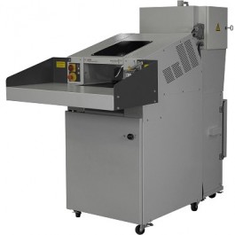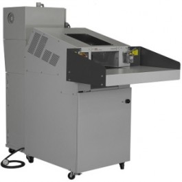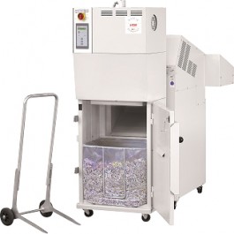 Obliterates large quantities such as archives and bulk storage. Also shreds staples, paper clips, credit/store cards, CDs/DVDs, floppy disks, and USB sticks. Convenient material feeding via non-slip conveyor belt. Shredder material is compressed into compact bales and can optionally be cleanly disposed of in a box or waste bag. Manual oiler for consistently high cutting capacity. Compresses 6-8 bales per hour. Lifetime warranty on cutting cylinder. Automatic return eliminates paper jams. Continuous Duty Operation ensures continual shredding with no down time. Cutting rollers made of hardened solid steel. Light barrier for automatic start of the compression process. TAA Compliant. Durable gear motor with chain drive for long-term shredding. Auto stop with LED, stand-by mode with LED indicator. User safety through emergency off switch. Practical removal trolley for the easy removal of bales. Mobile on castors.