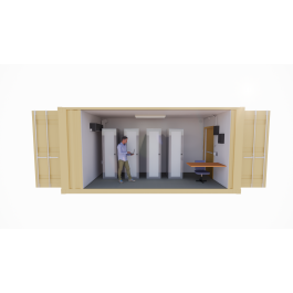 This 20-foot ISO shipping container is built to hold up to four server racks (24”x36”), plus one (1) IT workstation with receptacle and 1 shielded Cat 6 network connection. It is built to ICD 705 standards for SCIF or SAPF accreditation. It meets STC 50 acoustic protection and the minimum TEMPEST recommendations, as dictated by the ICD 705 Tech Spec V1.5. Server room includes Kaba Mas X10 series locking device, UL 2050-compliant Intrusion Detection System (IDS), GSA APL-approved Access Control System (ACS), CCTV, and five (5) tons of cooling with a split ductless HVAC system, and six (6) electrical receptacles. To accommodate server racks, up to four (4) 30-amp dedicated twist- lock receptacles for network equipment are included. Each Rapid SCIF container includes unlimited accreditation consulting support, including draft sections of Construction Security Plan (CSP), and Pre- Construction Checklist, construction information for your Fixed Facility Checklist (FFC), and photo documentation.