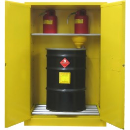 Safe, convenient and centralized storage for Flammables. Vertical Drum Cabinets have ball bearing rollers for easy placing and removal of 55 gallon drums. From one to twelve 5-gallon safety cans can also be stored depending on the model. Horizontal Cabinets store one 55 gallon drum and one 5 gallon safety can. Drum cradles available. Horizontal cabinets have tracks to guide Drum Cradle into position. Choose from 3 door styles.